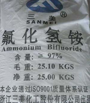 用途:主要用于磨砂玻璃生产中玻璃刻蚀剂(与氢氟酸并用),可用作化学试剂、发酵工业消毒和防腐剂、由氧化铍制金属铍的溶剂及硅钢板的表面处理剂。还用于制造陶瓷、镁合金、锅炉给水系统和蒸汽发生系统的清洗脱垢,以及油田砂石的酸化处理。也用作烷基化异构化催化剂组分。